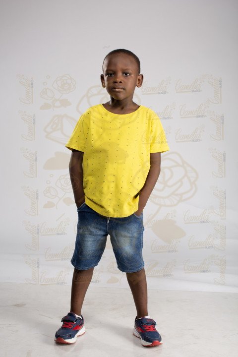 Jeune Petit GarÇon t-shirt jaune culotte jean tennis bleu blanc rouge