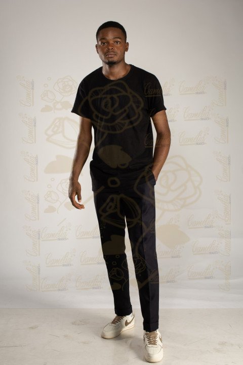 Jeune homme Africain t-shirt noir pantalon noir main dans la poche