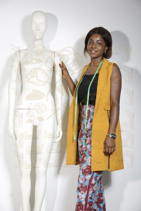 Coutuière souriante en veste jaune et accessoires de couture tenant un mannequin en blanc