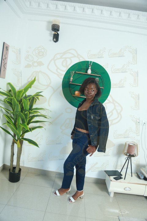 Top model teint chocolat veste jeans talon blanche pot de fleur