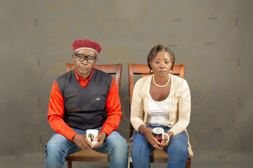 Un couple d'adulte africain assis sur une chaise chacun , avec un look décontracté, tenant chacun une tasse
