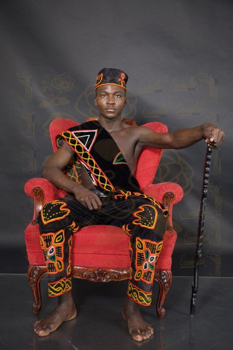 Jeune Africain noir charisme canne tenue traditionnelle fateuil rouse