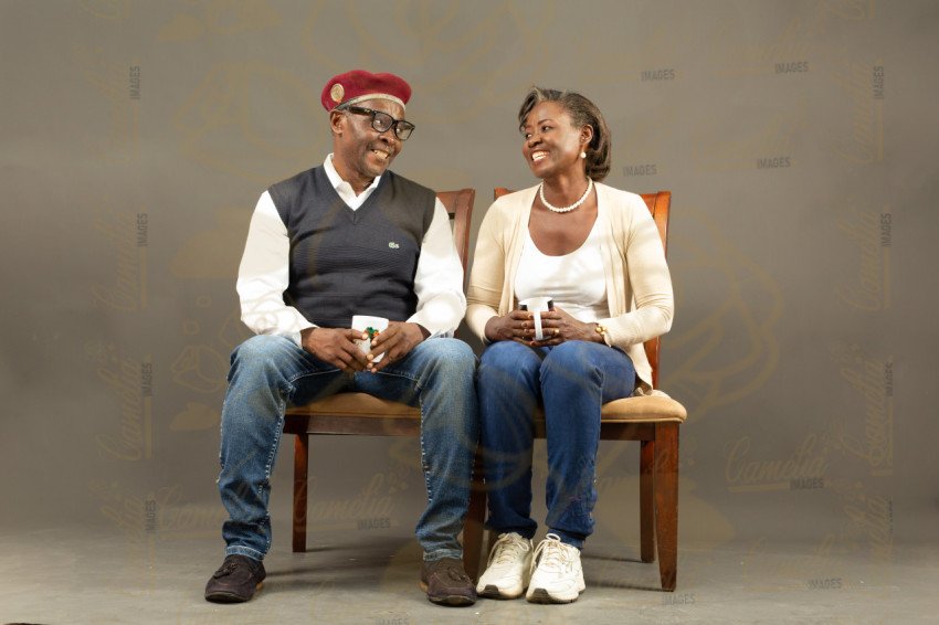 Un couple d'adulte afro assis côte à côte, au look décontracté, tenant des tasses , partageant un sourire complice