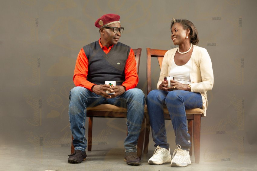 Un couple d'adulte africain assis sur des chaises , avec un look décontracté , des regards amoureux, tenant chacun une tasse
