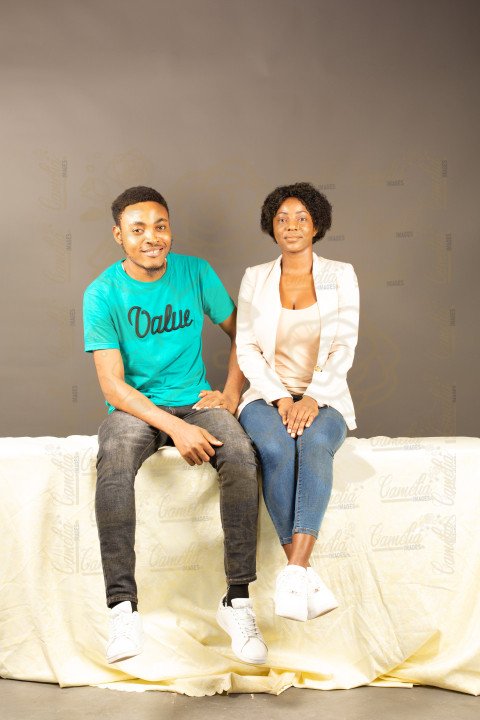 Un jeune couple africain assis cote à cote, les pieds croisés et repliés vers soi même, style simple et décontracté
