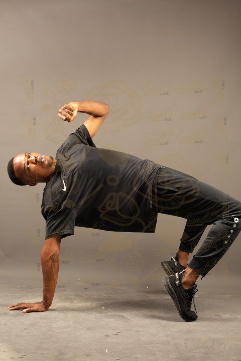 Un jeune-homme africain en noir , faisant des acrobaties , style décontracté et sportif