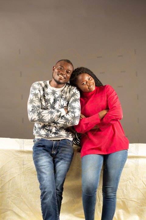Un jeune couple africain , assis l'un prêt l'un de l'autre avec un léger sourire, style décontracté