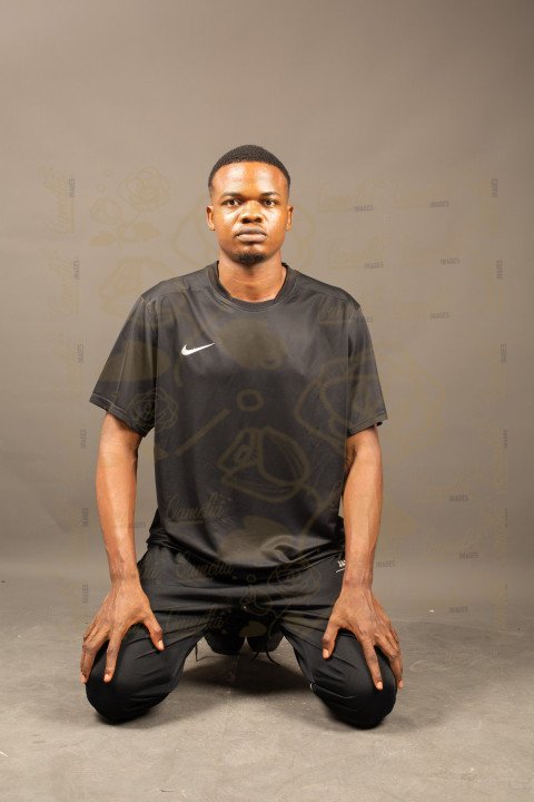 Un jeune-homme africain, à genoux ,style décontracté et sportif
