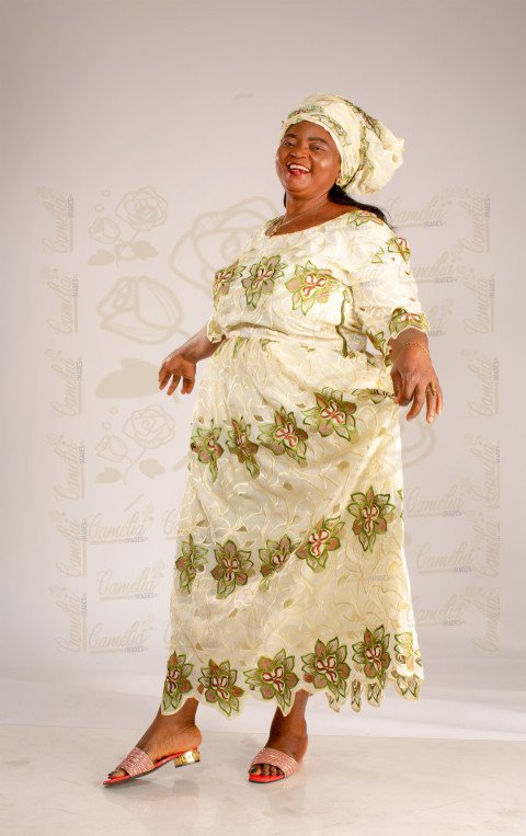 Une femme africaine sexagénaire, vêtu d'une robe blanche avec des motifs de fleurs , avec des mules