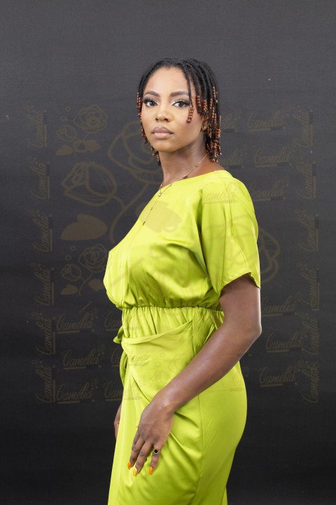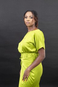 Une jeune femme afro arborant une tenue verte , coiffée de courts rastas, de profil tout en fixant l'objectif