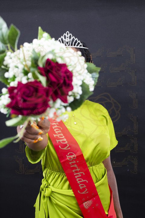 Une jeune femme Afro,vêtue de vert, une écharpe rouge de joyeux anniversaire, un diadème sur la tête,et tenant un bouquet de fleurs