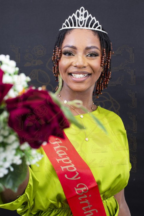 Une jeune femme Afro, souriante, en ténue verte ,avec une écharpe de joyeux anniversaire rouge et des écritures dorées, et un diadème sur sa tête
