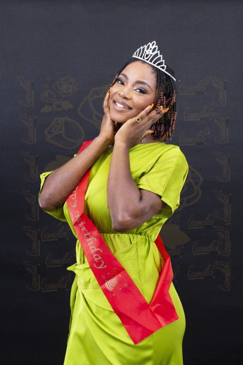 Une belle jeune femme Afro, souriante, en ténue verte ,avec une écharpe de joyeux anniversaire rouge, et un diadème sur sa tête