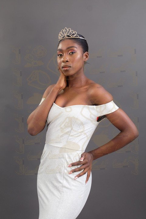 Une belle jeune femme afro vêtue d'une longue robe élégante avec un diadème sur sa tête.