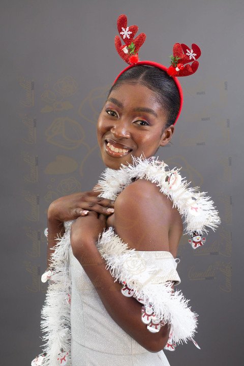 Une belle jeune femme afro , souriante, vêtue d'une robe a avec des décorations de Noël.
