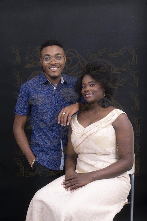 Une jeune femme et un jeune homme,souriants, fixant l'objectif, une pose simple, style décontracté.