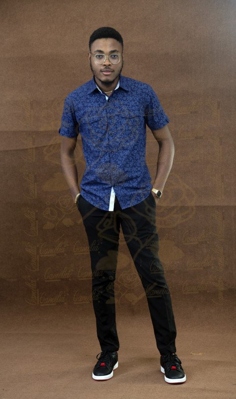 Un jeune homme noir,avec des lunettes, vêtu d'une chemisette bleue , pantalon noir , style décontracté.