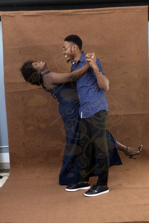 Un jeune couple afro souriant, avec une pose affectueuse et affirmant leur relation amoureuse.