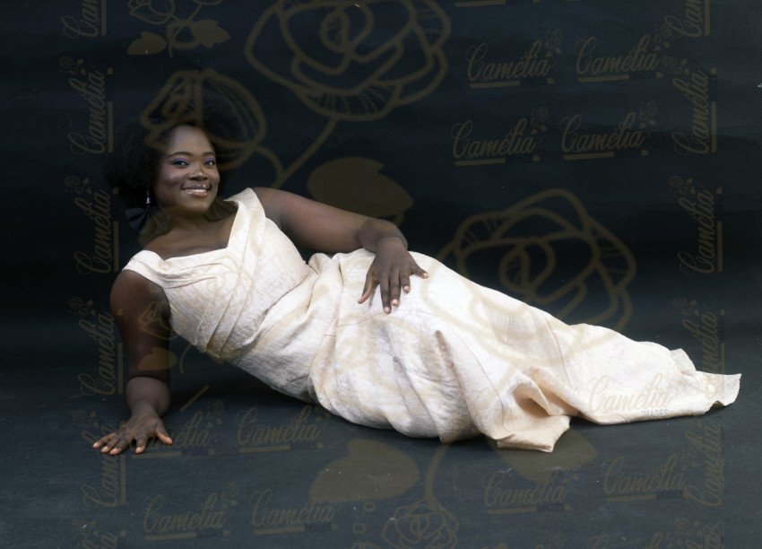 Belle jeune femme noire ,vêtue d'une longue robe élégante ,souriante, à moitié couchée .