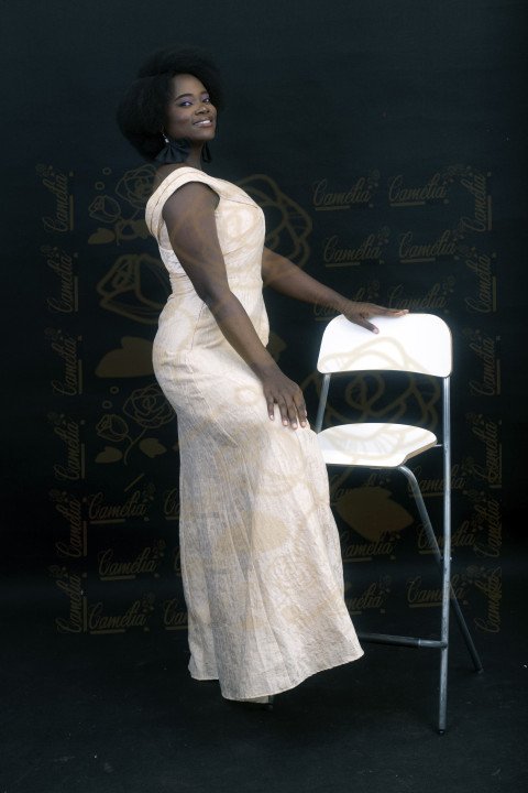 Belle jeune femme noire souriante, vêtue d'une longue robe, prenant une pose élegante sur une chaise haute.
