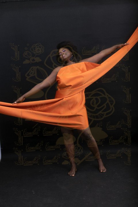 Une femme noire rayonnante, vêtue d'une robe orange élégante et d'un maquillage violet, pose avec grâce devant un fond sombre.