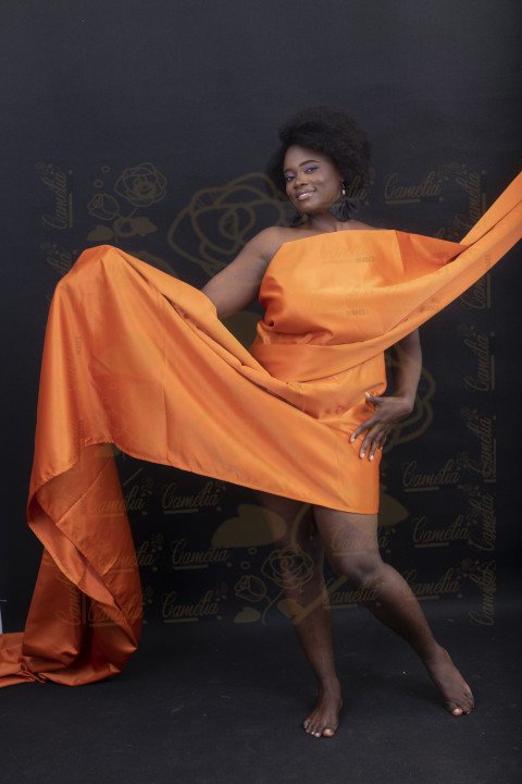 Une femme noire rayonnante, vêtue d'une robe orange élégante et d'un maquillage violet, pose avec grâce devant un fond sombre.