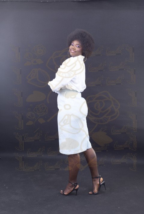Jeune femme noire souriante,allure imposante, fixant l'objectif, vêtue d'une chemise blanche et d'une jupe grise claire, cheveux afro.