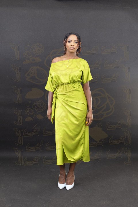 Une femme noire est photographiée dans un studio, vêtue d'une robe asymétrique vert citron élégante, posant avec assurance devant un fond gris uni.