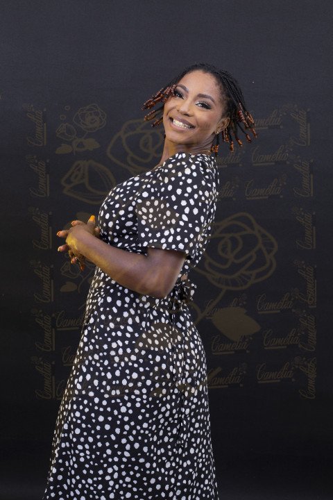 Femme africaine,souriante, élégante avec une pose joyeuse, vêtue d'une robe imprimée noire et blanche, aux tons sombres.