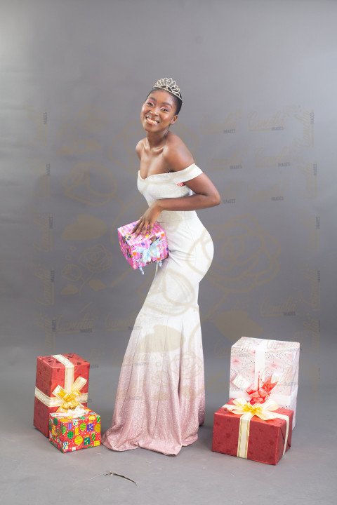 Jeune femme noire élégante, souriante,joyeuse, avec une robe de soirée glamour,avec un diadème, avec des joliments emballés à ses côtés.