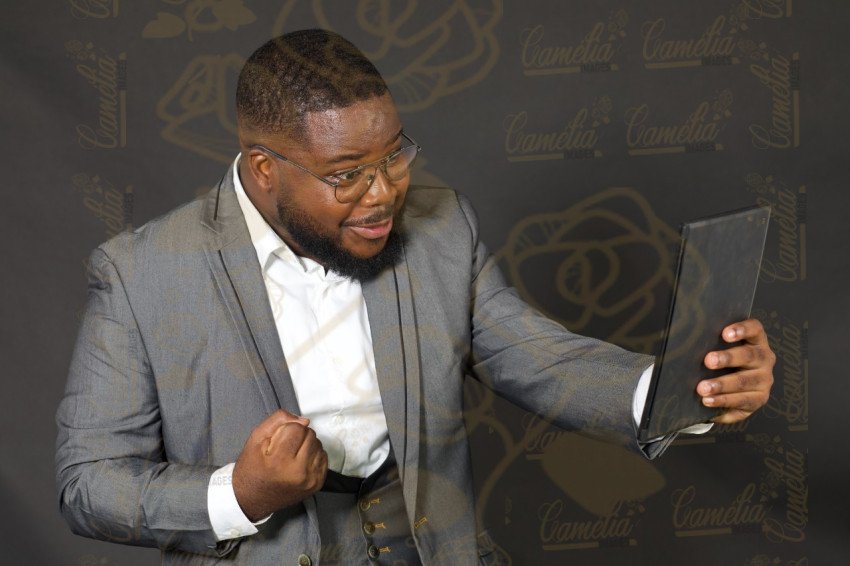 Homme affaire africain jubiler victoire lunettes joie costumes veste
