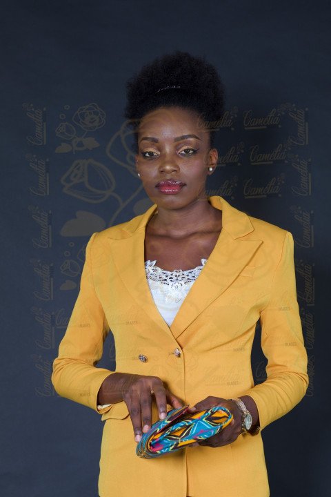 Femme Affaire jeune talon noir costume jaune sac main afritude