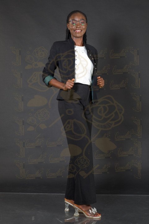 Femmes Africaines teint chocolat veste noire bleu et jaune negociation business