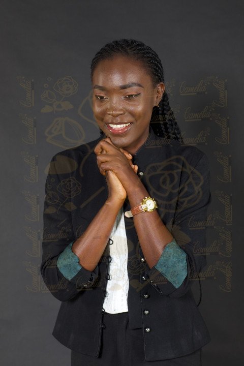 Une jeune-femme africaine , se tenant les jambes fléchies , style décontracté