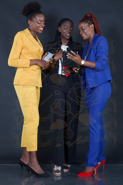 Femmes Africaines teint chocolat veste noire bleu et jaune negociation business
