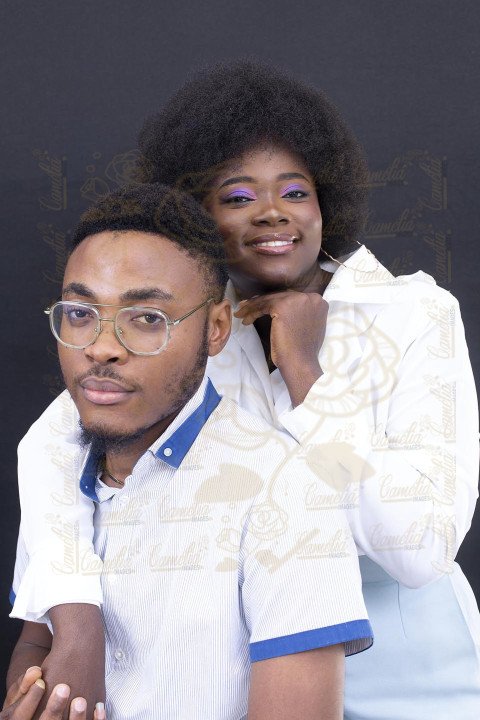 Un jeune couple africain , l'un contre l'autre souriant avec une attitude complice, style décontracté