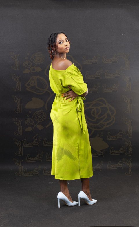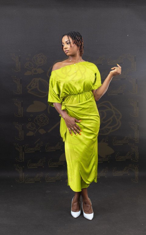 Une femme noire est photographiée dans un studio, vêtue d'une robe asymétrique vert citron élégante, posant avec assurance devant un fond gris uni.