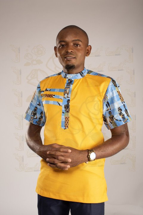 Jeune homme teint claire veste jaune design afrique pantalon noire chaussure blanche