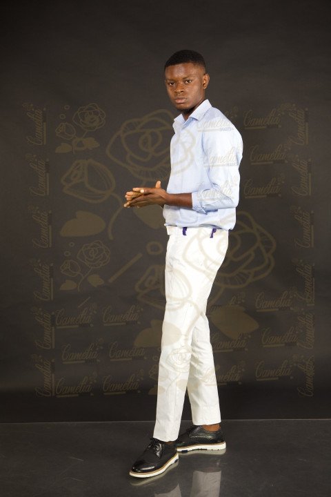 Jeune Homme Africian mannequin lunette noire chemise bleu pantalon blanc paire noire