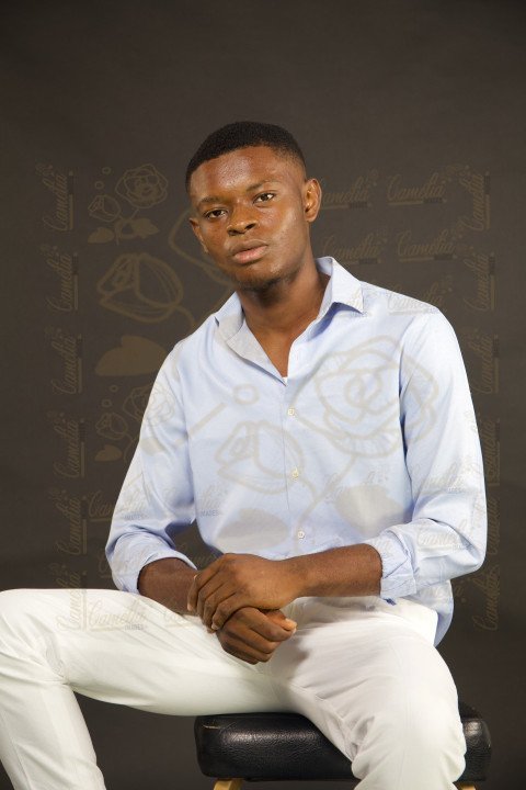 Jeune Homme africain mignon polo blanc culotte jaune chaussettes et tennis blanches