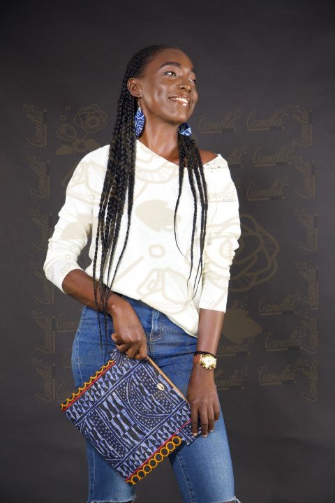 Jeune femme africaine robe blanc noire main reins lunettes rouge lèvre