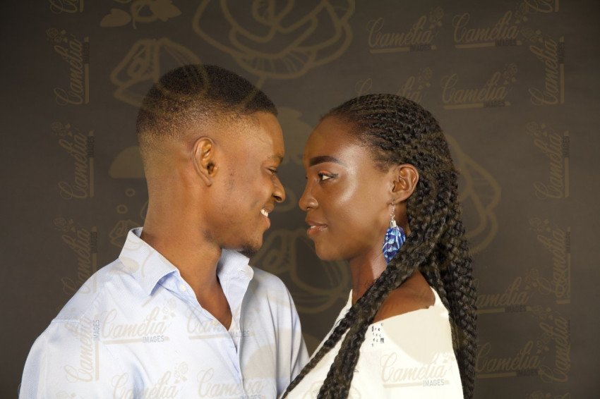jeune garçon teint noir t-shirt noir s'enlaçant avec une jolie fille