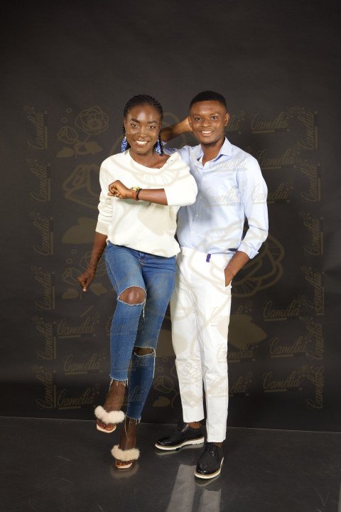 Famille Africaine papa maman fille sourire costume bleu paire noire robe fleur