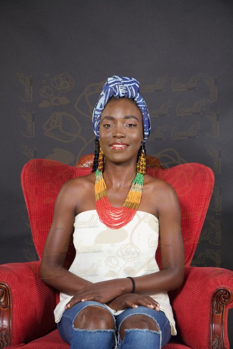 Jeune femme beauté africaine jolie sourire rouge a lèvre foulard boucles colliers afritude