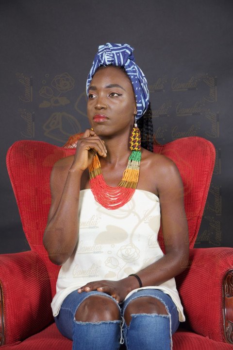 Jeune petite fille africaine foulard jaune cabas ceinture talon rose