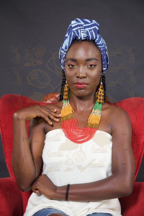 Jeune femme robe colliers boucles traditionnelle teint caramel