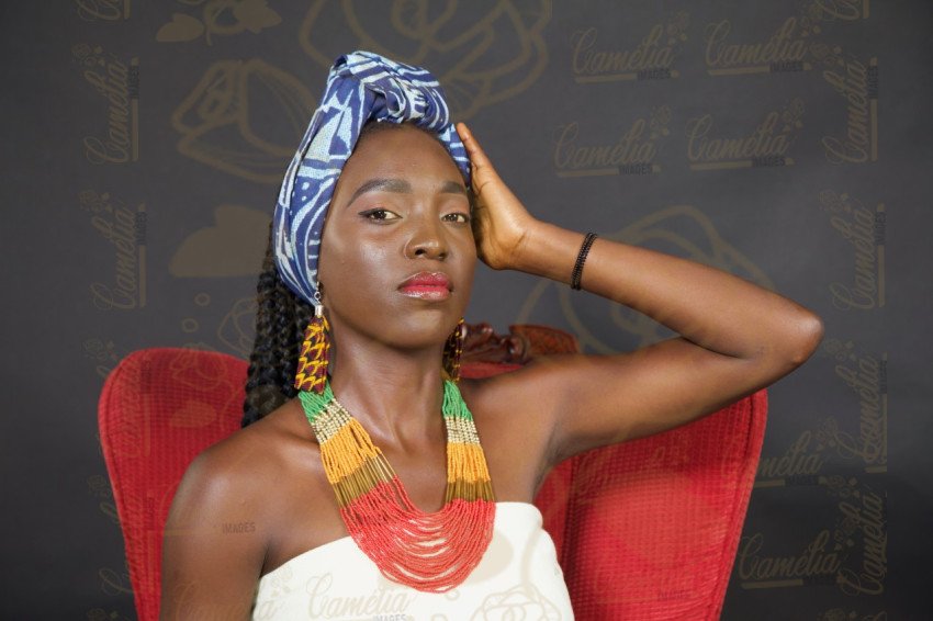 Femme africaine regard fixe foulard boucle oreilles foulard afritude