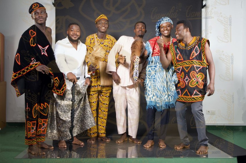 Famille Africaine maman fille sourire costume bleu paire noire robe fleur
