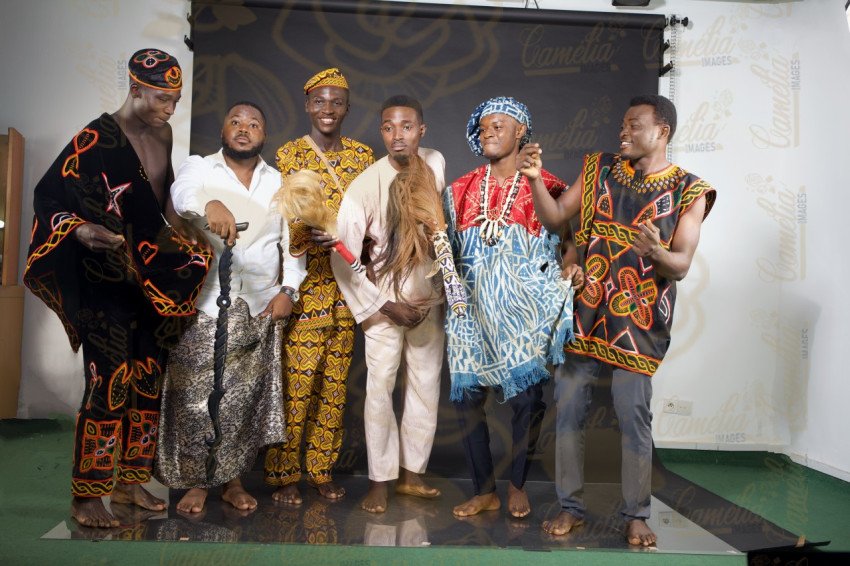 Papa Africain grimasse bouche main dans la poche uniforme ensemble noir ,