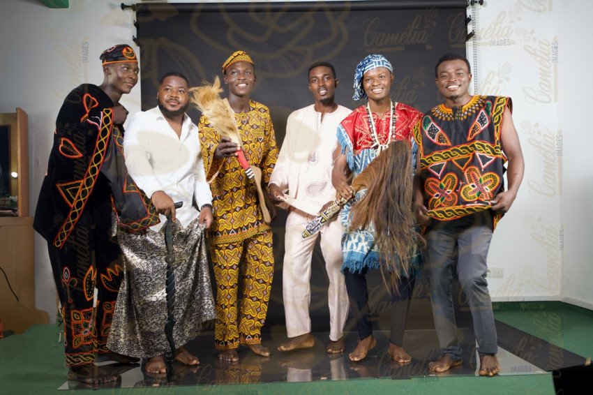 Une femme noire rayonnante, vêtue d'une robe orange élégante et d'un maquillage violet, pose avec grâce devant un fond sombre.